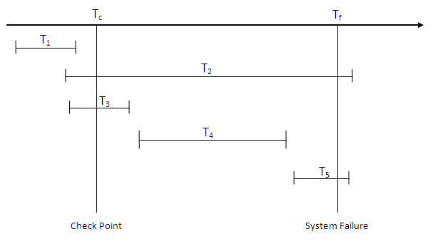 จากภาพกำหนดใน T1, T2, T3, T4 และ T5 หมายถึง Transaction ต่างๆ ในระบบ Tc และ Tf ซึ่งหมายถึงเวลาที่ระบบ DBMS ทำการตรวจสอบสถานภาพการทำงานของ Transaction ต่างๆ สมมติว่าระบบเกิดความขัดข้อง(System failure) ณ เวลาที่ Tfและมีจุดตรวจสอบ(Check Point)ครั้งสุดท้าย กระทำขึ้น ณ เวลา Tc จงตอบคำถามต่อไปนี้ โดยอาศัยข้อมูลต่างๆของแต่ละ Transaction ประกอบดังนี้