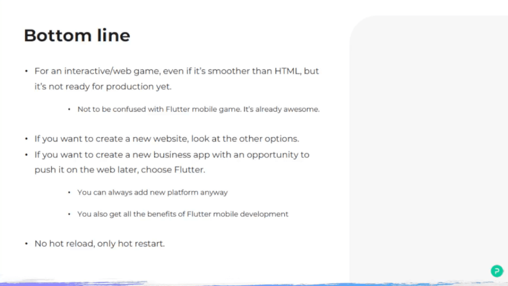 - สำหรับเรื่อง SEO ที่เป็นข้อจำกัด อันนี้ Speaker เสนอ Solution ไว้ด้วยนะ - ทำหน้าแรกสำหรับ SEO แล้วพอ Login มาได้ก็ Redirect มาที่ Flutter