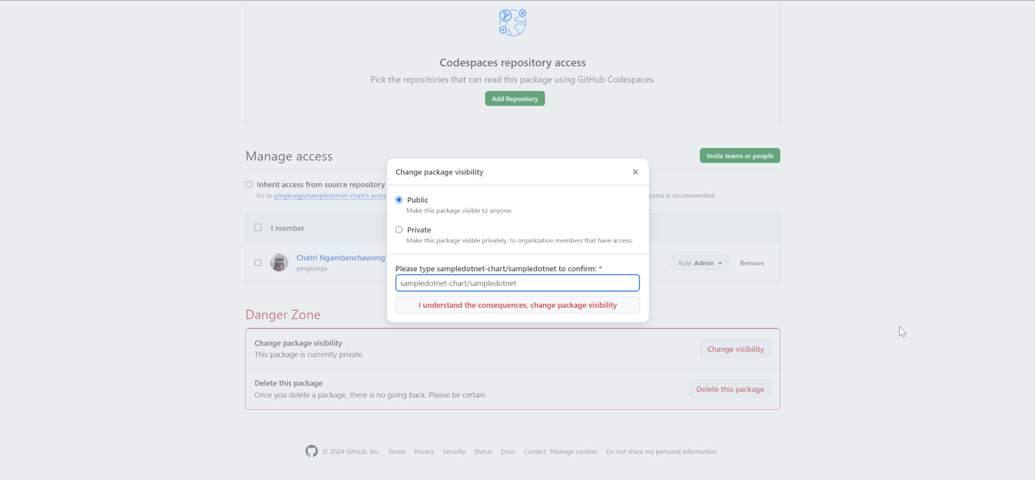 helm push sampledotnet-0.1.0.tgz oci://ghcr.io/pingkunga/sampledotnet-chart Pushed: ghcr.io/pingkunga/sampledotnet-chart/sampledotnet:0.1.0 Digest: sha256:0ad7255e45d43a0fcc0eec09830469ed8d6466a93d2b5f942ee97a20047f19b3