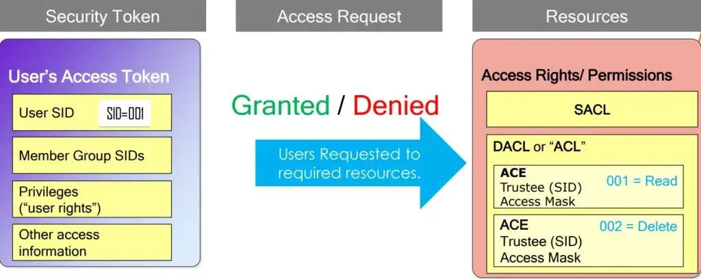 • A – Access (Permission) สิทธิ์ที่ได้รับ เช่น Read, Write, Modify, Full Control