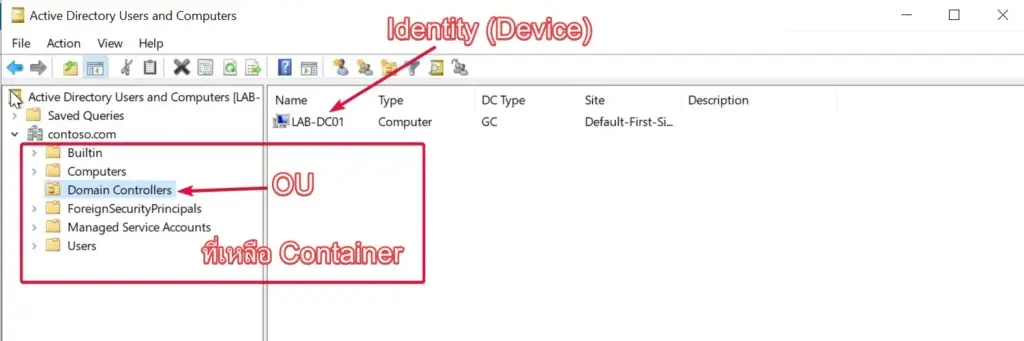 • User Accounts, Group Accounts, Computer Accounts (เครื่องที่ Join AD), Printers