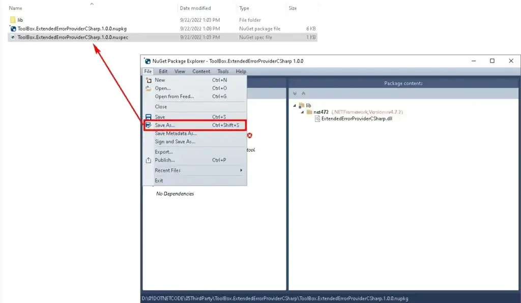 After preparing the NuGet data completely, the next step is to Pack it into a NuGet Package. Select menu File > Export or File > Save As, then follow the steps accordingly.