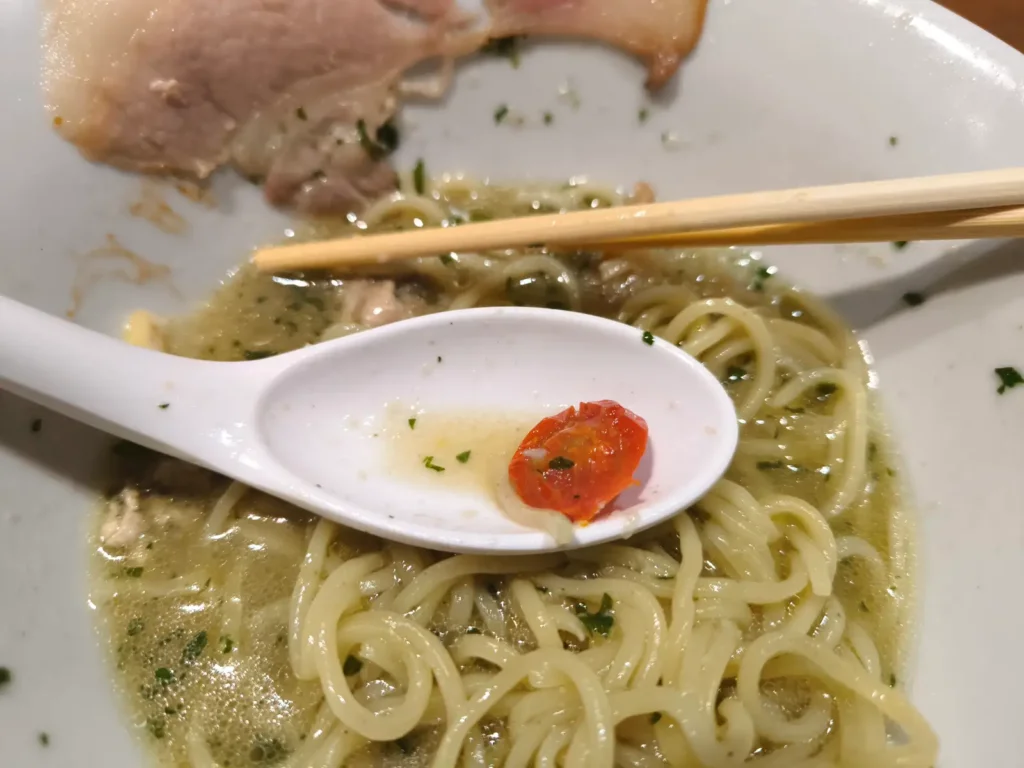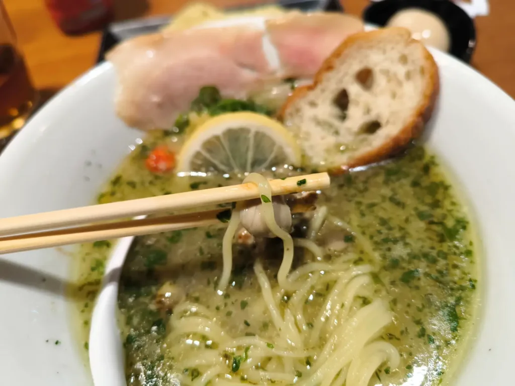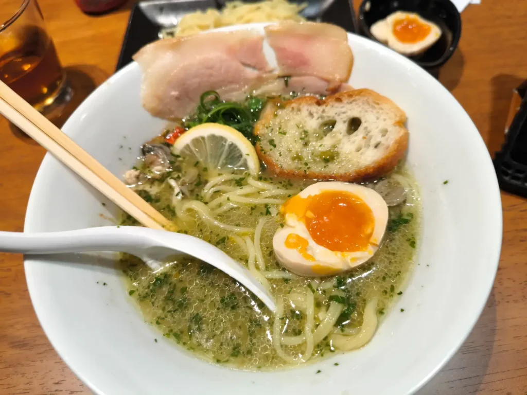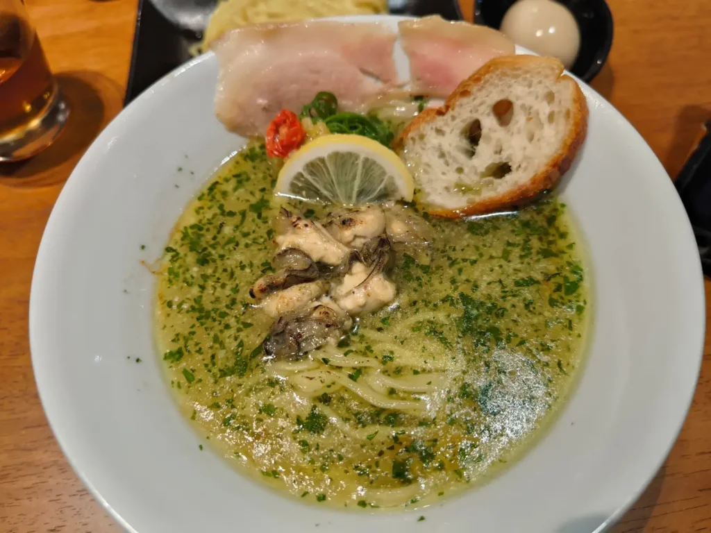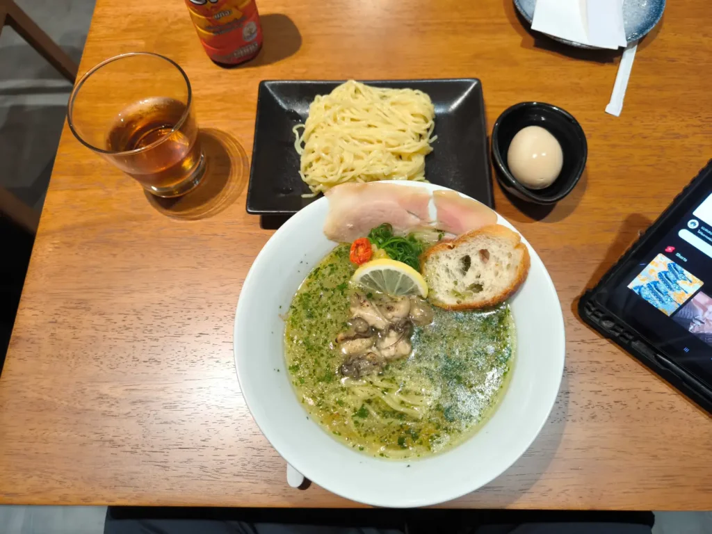ของผมสั่ง Oyster Shio Ramen “Vongole” Style เอา Option น่าจะหมดเลย เปลี่ยนเส้นเป็น Homemade + เพิ่มเส้นด้วย และมีเพิ่มไข่อาจิกามะ หลังจากรอพักใหญ่ตัวราเมงก็มา