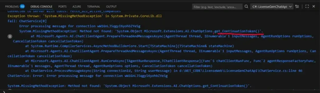 [NET] System.MissingMethodException: Method not found: System.Object Microsoft.Extensions.AI.ChatOptions.get_ContinuationToken()