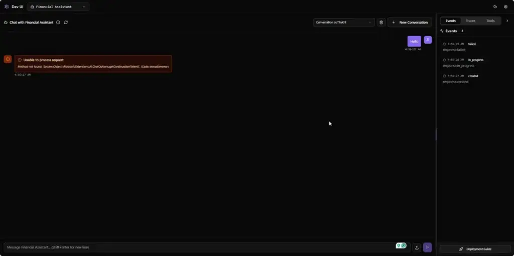 อันนี้เป็น Error ในหน้าจอ Dev UI ของ Microsoft Agent Framework