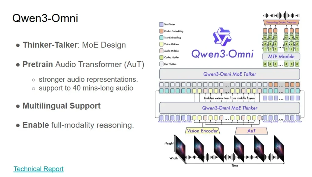 - มันเลยมี Idea ทำ Unified Token space โดยใช้ TMRoPE ของทาง Qwen ที่มา Map Encode ว่า Gate ได้จัดการ Modalrity ไหนอยู่ โดยเจ้า โดยเจ้า Qwen3-Omni มีตัว MoE Thinker ผมมองว่าเหมือนจัดคิวทำงานนะ พอรู้ว่าอะไรอยู่ไหน เรารีด Perf ออกมาได้นะ แยก Parameter ของ Model ออกมาเป็นส่วนๆ เข่น Model 30B แบ่ง