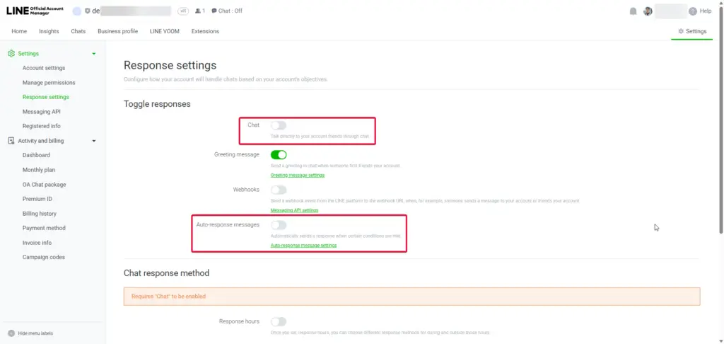 สำหรับการแก้เข้าไปที่ https://manager.line.biz/ แล้วเลือก OA ที่ต้องการSettings > Response settings