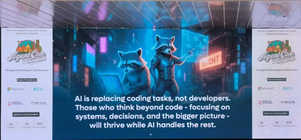 สำหรับงานวันนี้ Comminuty ของ Global AI Bangkok ที่ตึก K+ สามย่านครับ เนื่องจากหัวข้อ ผมไม่รู้ว่าจะเข้าอันไหน มันแยก Track เยอะ เลยให้ Gemini เลือกให้ ว่าตัวเราที่เป็น Role Dev ต้องมาฟังอันไหน
