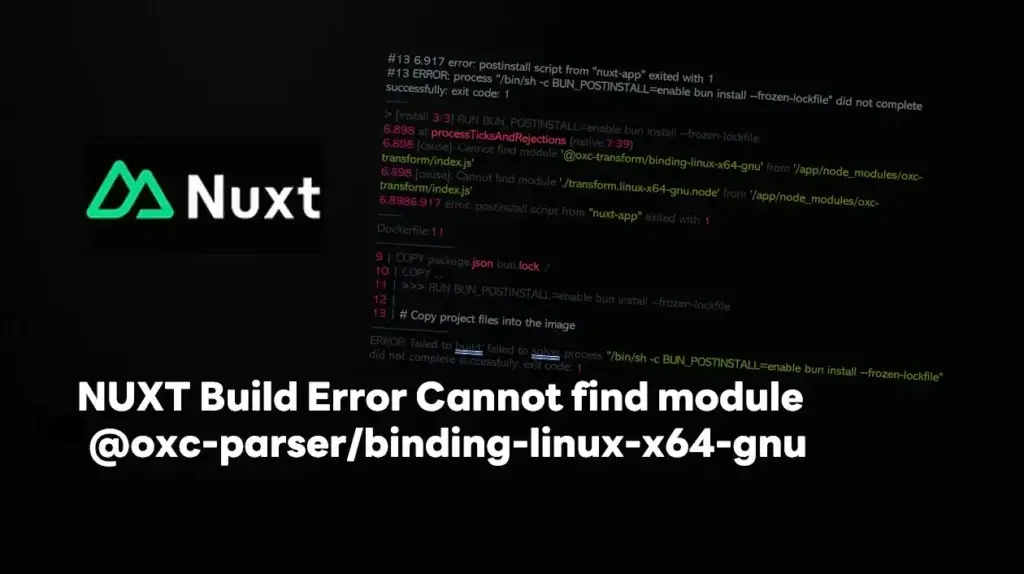 #13 0.388 bun install v1.3.9 (cf6cdbbb) #13 6.192 #13 6.192 $ nuxt prepare #13 6.898 #13 6.898 ERROR Cannot find native binding. npm has a bug related to optional dependencies (https://github.com/npm/cli/issues/4828). Please try npm i again after removing both package-lock.json and node_modules directory. #13 6.898 #13 6.898 at node_modules/oxc-transform/index.js:575:15 #13 6.898 at moduleEvaluation (native:1:11) #13 6.898 at moduleEvaluation (native:1:11) #13 6.898 at requestImportModule (native:2) #13 6.898 at processTicksAndRejections (native:7:39) #13 6.898 #13 6.898 [cause]: Cannot find module '@oxc-transform/binding-linux-x64-gnu' from '/app/node_modules/oxc-transform/index.js' #13 6.898 #13 6.898 #13 6.898 [cause]: Cannot find module './transform.linux-x64-gnu.node' from '/app/node_modules/oxc-transform/index.js' #13 6.898 #13 6.917 error: postinstall script from "nuxt-app" exited with 1 #13 ERROR: process "/bin/sh -c BUN_POSTINSTALL=enable bun install --frozen-lockfile" did not complete successfully: exit code: 1 ------ > [install 3/3] RUN BUN_POSTINSTALL=enable bun install --frozen-lockfile: 6.898 at processTicksAndRejections (native:7:39) 6.898 6.898 [cause]: Cannot find module '@oxc-transform/binding-linux-x64-gnu' from '/app/node_modules/oxc-transform/index.js' 6.898 6.898 6.898 [cause]: Cannot find module './transform.linux-x64-gnu.node' from '/app/node_modules/oxc-transform/index.js' 6.898 6.898 6.898 6.917 error: postinstall script from "nuxt-app" exited with 1 ------ Dockerfile:11 -------------------- 9 | COPY package.json bun.lock ./ 10 | COPY . . 11 | >>> RUN BUN_POSTINSTALL=enable bun install --frozen-lockfile 12 | 13 | # Copy project files into the image -------------------- ERROR: failed to build: failed to solve: process "/bin/sh -c BUN_POSTINSTALL=enable bun install --frozen-lockfile" did not complete successfully: exit code: 1