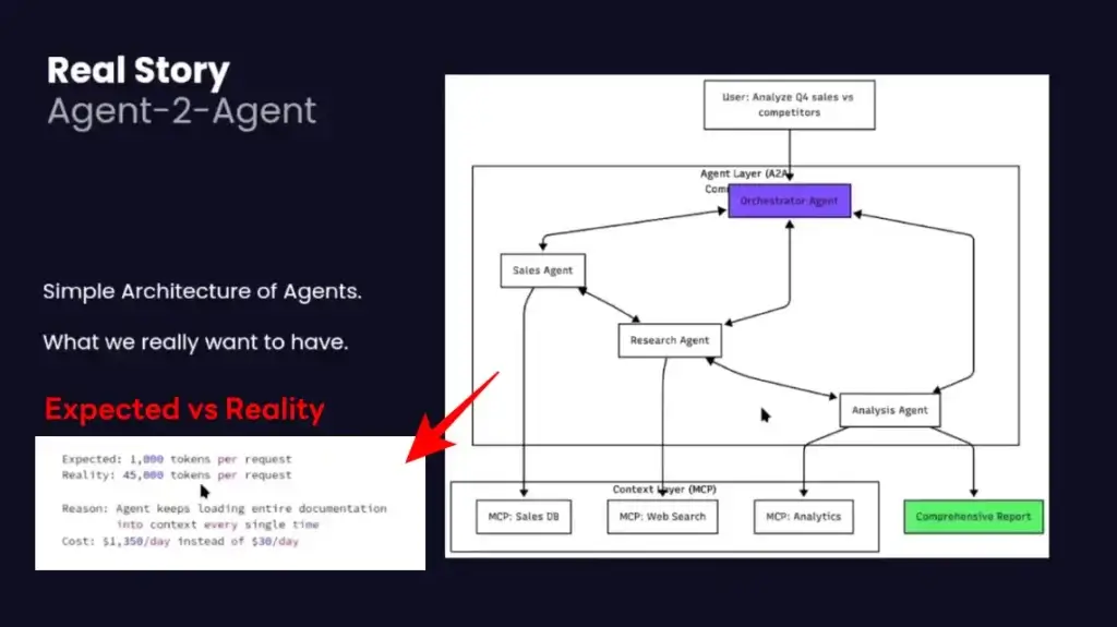 📌 การใช้ Agent คุยกันเองเพื่อแก้ปัญหา แต่ Agent คุยกันวนไปมาจนค่า Token พุ่งสูงจาก 1,000 เป็น 45,000 ต่อ Request และเสียค่าใช้จ่ายเพิ่มจาก 30 เหรียญเป็น 1,350 เหรียญต่อวัน โดยงานไม่เสร็จ !!!