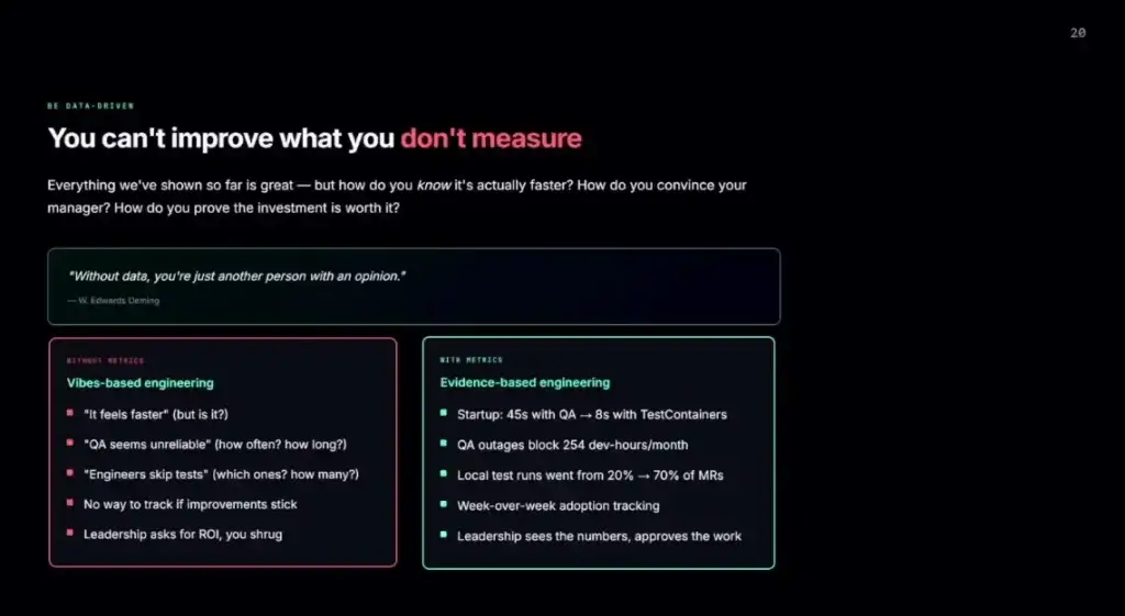 📌 Speaker พบว่าการพัฒนาซอฟต์แวร์ในเครื่อง Local มักติดปัญหาเรื่อง QA Dependency มันต้องเชื่อมต่อกับระบบ QA ส่วนกลางของ Agoda อย่างเช่น