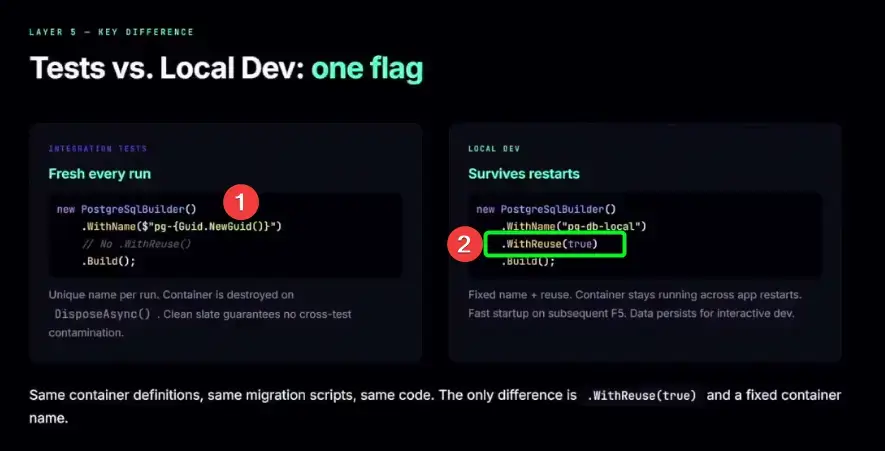 | Setup | Manual config / VPN | CLI commands outside IDE | dotnet test / F5 |