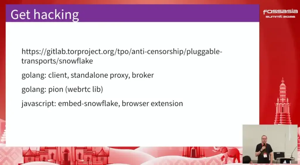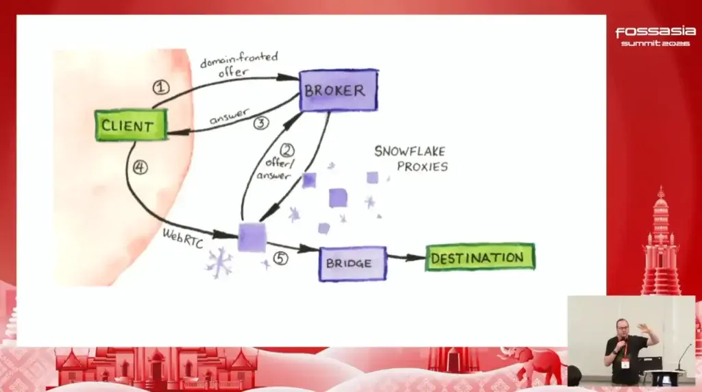 Snowflake ตอนแรกผมไปนึกถึง Software อีกตัวที่ทำงานด้าน Data นะ แต่ใน Talk ฟังแล้ว Wow มันเป็น Software ที่ต่อยอดมาจาก TOR Network ที่ช่วยผู้คนในพื้นที่ที่มี Block / Censor เนื่อหาอย่างรุนแรงเข้าถึงเนื่อหาภายนอกได้ อารมณ์เหมือนเป็น Proxy ไปเข้่า TOR Network โดยมีหลักการทำงานที่เข้าใจมาตามนี้