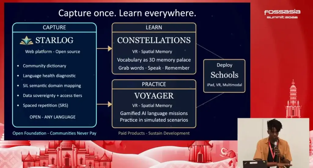 Idea: Language is identity - Speaker มี Idea พัฒนาเครื่องมือที่ไม่ได้แค่สอนภาษาทั่วไป แต่เน้นไปที่การอนุรักษ์ภาษาท้องถิ่นหรือภาษาที่หาเรียนยาก (Heritage Languages) เช่น ภาษาพื้นเมืองในไต้หวัน โดยใช้หลักการจดจำด้วยภาพและพื้นที่ (Spatial Memory)
