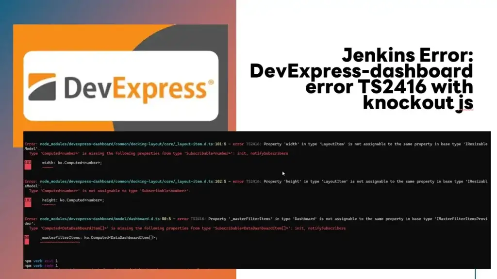 ubuntu@BuildAgent01:~/Code/ClientApp$ npm run build --verbose npm verb cli /home/ubuntu/.nvm/versions/node/v18.17.1/bin/node /home/ubuntu/.nvm/versions/node/v18.17.1/bin/npm npm info using [email protected] npm info using [email protected] npm verb title npm run build npm verb argv "run" "build" "--loglevel" "verbose" npm verb logfile logs-max:10 dir:/home/ubuntu/.npm/_logs/2026-03-11T07_57_19_539Z- npm verb logfile /home/ubuntu/.npm/_logs/2026-03-11T07_57_19_539Z-debug-0.log > [email protected] build > ng build Workspace extension with invalid name (defaultProject) found. One or more browsers which are configured in the project's Browserslist configuration will be ignored as ES5 output is not supported by the Angular CLI. Ignored browsers: kaios 2.5, op_mini all ✔ Browser application bundle generation complete. ... Error: node_modules/devexpress-dashboard/common/docking-layout/core/_layout-item.d.ts:101:5 - error TS2416: Property 'width' in type 'LayoutItem' is not assignable to the same property in base type 'IResizableModel'. Type 'Computed<number>' is missing the following properties from type 'Subscribable<number>': init, notifySubscribers 101 width: ko.Computed<number>; ~~~~~ Error: node_modules/devexpress-dashboard/common/docking-layout/core/_layout-item.d.ts:102:5 - error TS2416: Property 'height' in type 'LayoutItem' is not assignable to the same property in base type 'IResizableModel'. Type 'Computed<number>' is not assignable to type 'Subscribable<number>'. 102 height: ko.Computed<number>; ~~~~~~ Error: node_modules/devexpress-dashboard/model/dashboard.d.ts:50:5 - error TS2416: Property '_masterFilterItems' in type 'Dashboard' is not assignable to the same property in base type 'IMasterFilterItemsProvider'. Type 'Computed<DataDashboardItem[]>' is missing the following properties from type 'Subscribable<DataDashboardItem[]>': init, notifySubscribers 50 _masterFilterItems: ko.Computed<DataDashboardItem[]>; ~~~~~~~~~~~~~~~~~~ npm verb exit 1 npm verb code 1