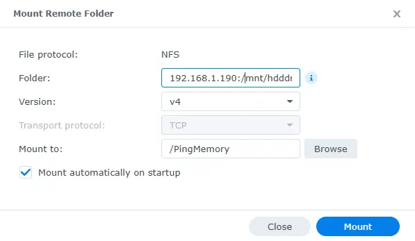 ➡️ In the Folder field, specify the remote folder path in the format of Remote_Server:/Remote_Folder_Path, such as 192.168.1.190:/mnt/hdddrive/nfs_alldata