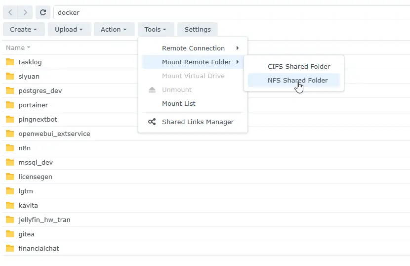 ➡️ Click Tools > Mount Remote Folder > NFS Shared Folder.