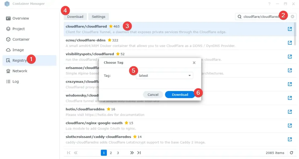 ติดตั้ง Container ของ Cloudflare Tunnel โดยเข้าที่ Container Manager > Registry หา Container จาก cloudflare/cloudflared ตามขั้นตอนเลย