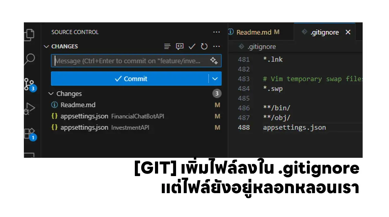 ช่วงนี้ทำ Side Project อยู่นี่แหละ แล้วที่นึกได้ว่ามีไฟล์มันไม่จำเป็นต้อง Commit เลยเพิ่มใน .gitignore แต่มันก็ยังให้ Commit อยู่ สงสัยตั้งชื่อผิด หรือ ป่าว ? ไม่น่าจะผิดนะ มีครบตามรูป Cover เลย วิธีแก้ เลยลองหา Google หาดูสรุป จากนั้น push ขึ้นไป จบไฟล์ appsettings.json ไม่หลอนให้ Commit แม้ว่าจะกำหนดใน .gitignore เรียบร้อยแล้วครับ สำหรับผมแล้วในเคสนี้แยก appsettings.example.json เอาไว้ อธิบายให้คนใช้งานต่อครับ อ๋อ แล้วก็ ถ้ามี…